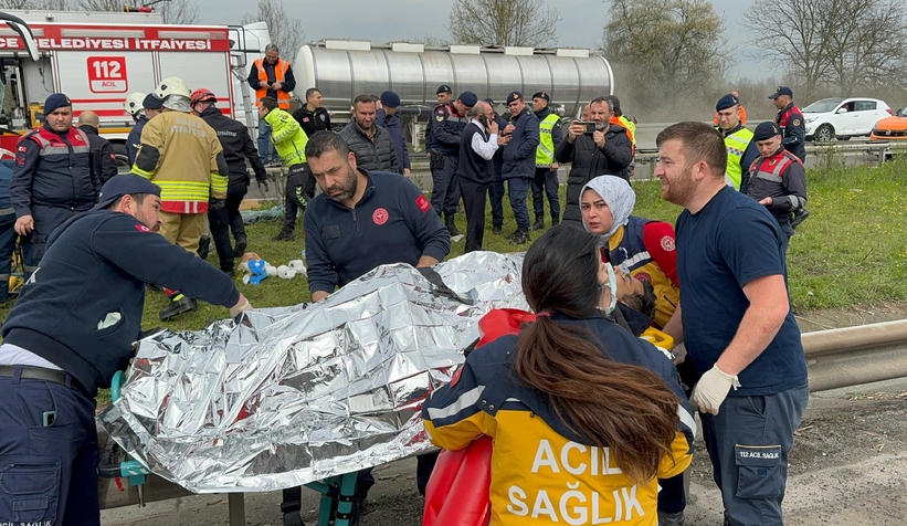 TEM Otoyolunda yolcu otobüsünün tıra arkadan çarpması neticesinde meydana gelen kazada 1'i ağır 17 kişi yaralandı. Ekiplerin kaza alanındaki müdahaleleri havadan da görüntülendi.