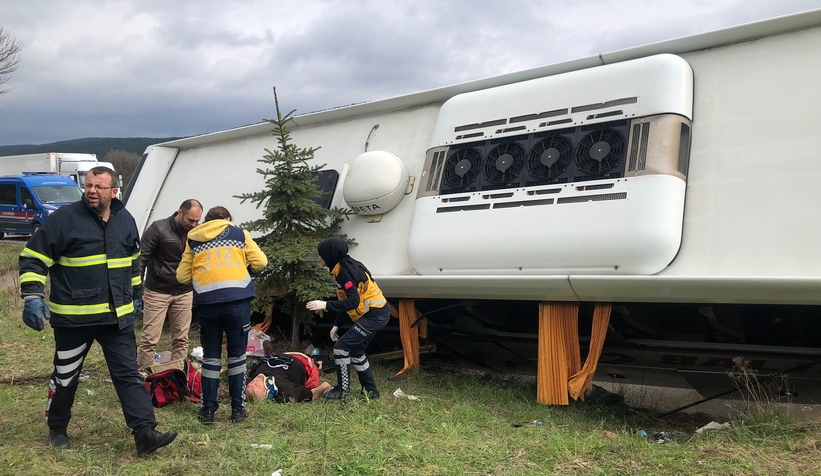 Bilecik'te seyir halindeki bir yolcu otobüsün devrilmesi sonucu meydana gelen trafik kazasında 1'i ağır 12 kişi yaralandı.