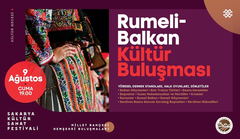 Büyükşehir Belediyesi tarafından Millet Bahçesi’nde düzenlenecek Sakarya Kültür Sanat Festivali programı kapsamında olan hemşehri buluşmaları 9 Ağustos Cuma günü Rumeli-Balkan Kültür Buluşmasıyla başlıyor.